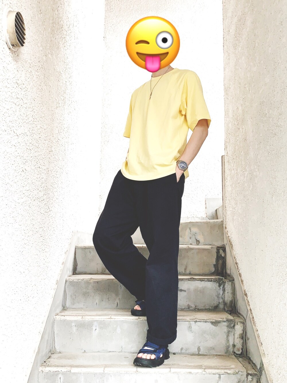 シンプルなサンダルコーデ MEIのサンダルのクッション性がすごい もはや歩くと弾むレベル Necklace:lgtm Tshirt:UNIQLO Watch:CITIZEN Pants:Dickies Sandal:MEI