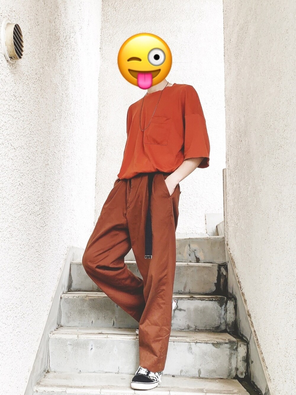 ワントーンコーデ Instagram kappa.kizakura 昨日に引き続きGUのビッグシルエットTシャツを使ったコーデ。 このパンツは古着屋で見つけた500円パンツ😃 黒を差し色にしました。 Necklace:MONOMART Tshirt:GU Belt:CONVERSE Pants:Renown Shoes:VANS