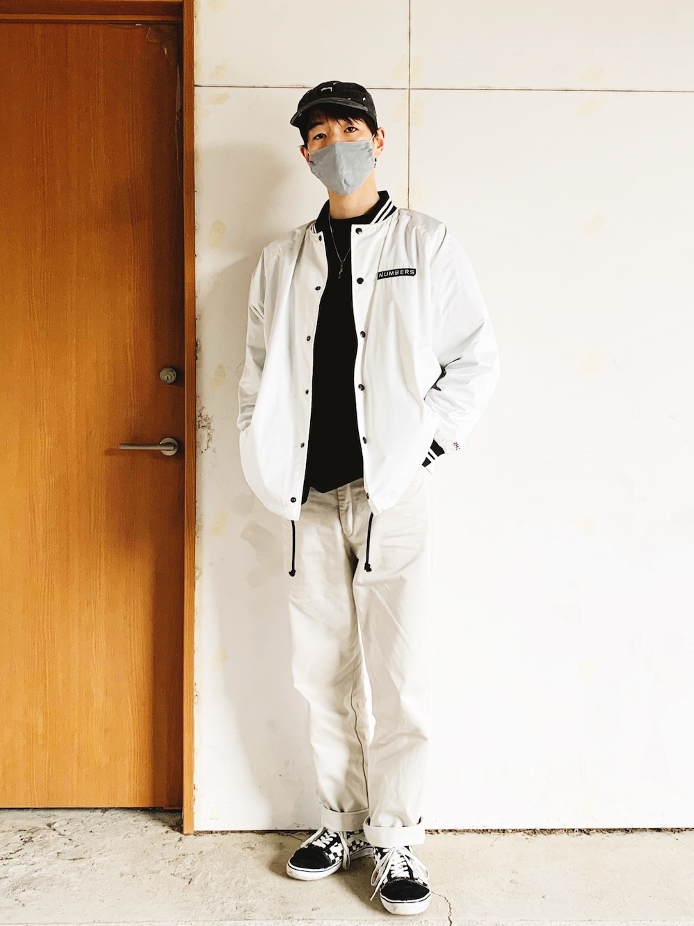 モノクロコーデ 今日のおやつはポップコーンでした Cap:Stussy Necklace:lgtm Tshirt:VANS Jacket:RonHerman×Numbers Pants:Yarmo Shoes:VANS