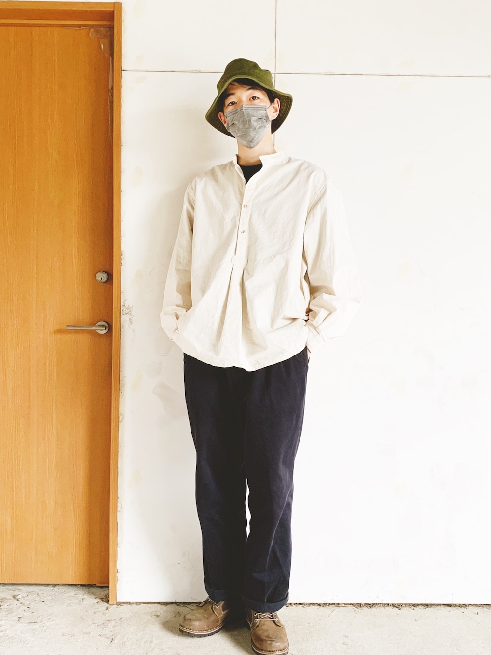 暑い日と肌寒い日が交互に来て、コーディネートが大変だね。 Hat:AIGLE Shirt:EuroMilitary Pants:Dickies Boots:EddieBauer