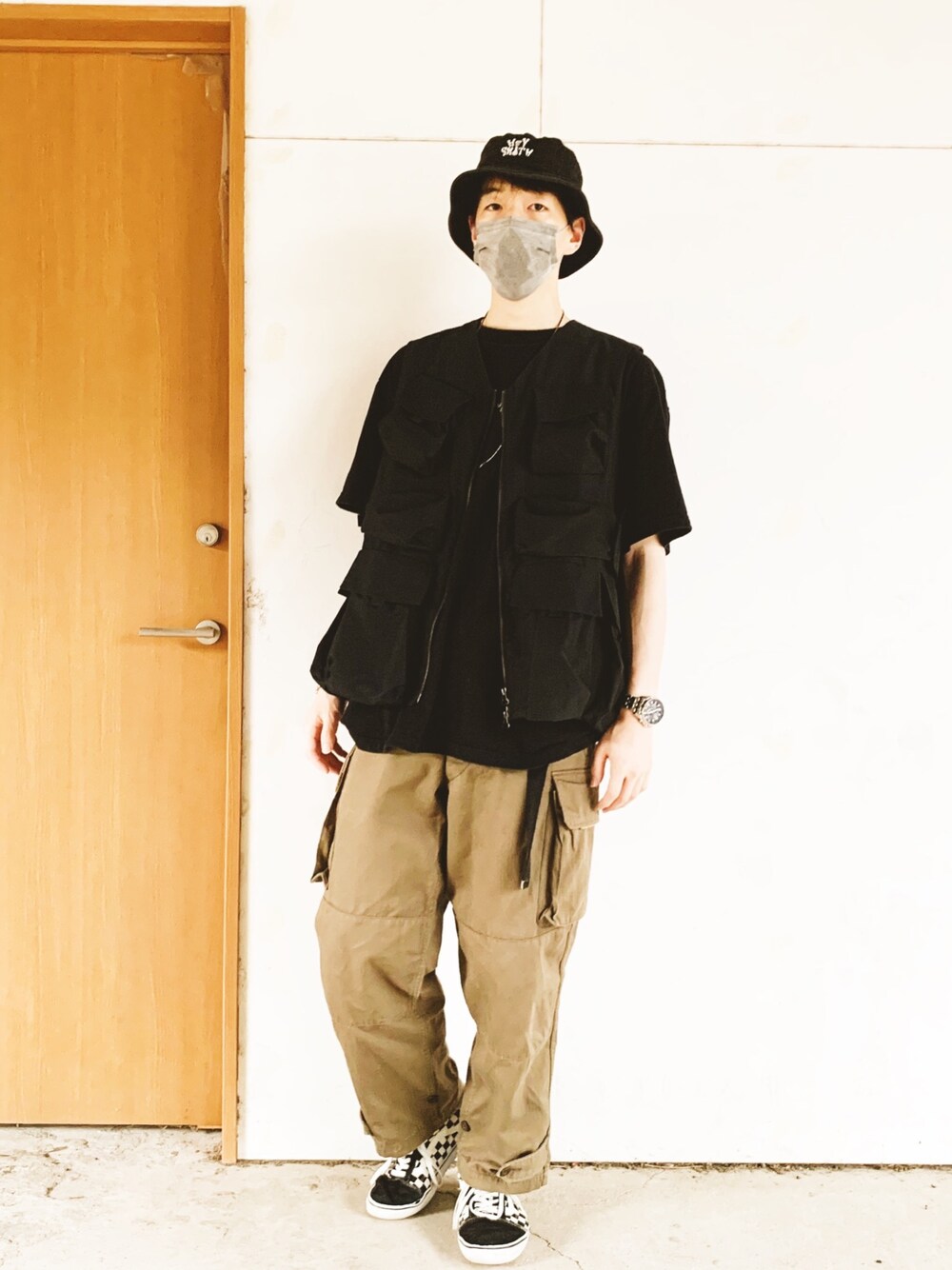初ベストコーデ ベスト着ると一気にストリート感出るね 今日はリユース検定の勉強とダンスしかしませんでした。ずっと家にいました。 Hat:HeySmith Tshirt:UnitedAthle Vest:AdamEtRope Pants:EuroMilitary Shoes:VANS