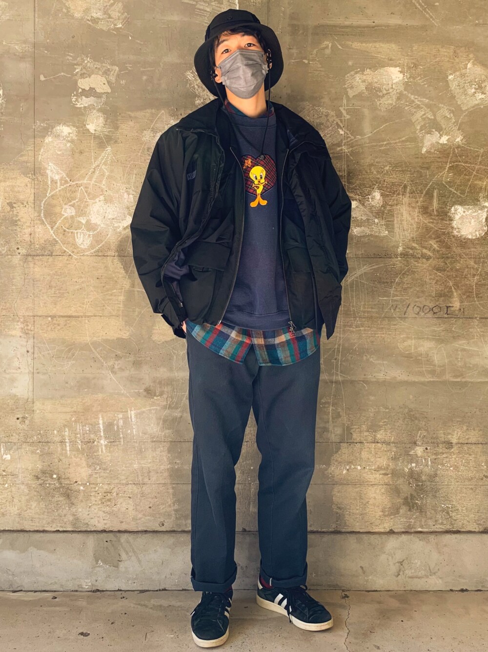 超レイヤードコーデ 80'sPENDLETONヴァージンウールシャツ 90'sLooneyTunesスウェット AdamEtRopeユーティリティベスト Columbiaナイロンジャケット Dickies874ワークパンツ Adidasキャンパス