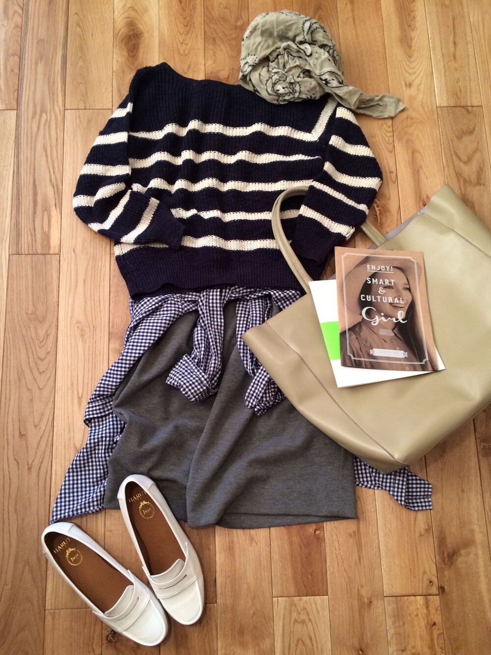 王道マリンなボーダーコーデ 原稿や雑誌がたっぷり入るトートはお仕事にもってこい~。グレイッシュな色味が合わせやすくて気に入っています。 knit:GLOBAL WORK bag:nano.universe