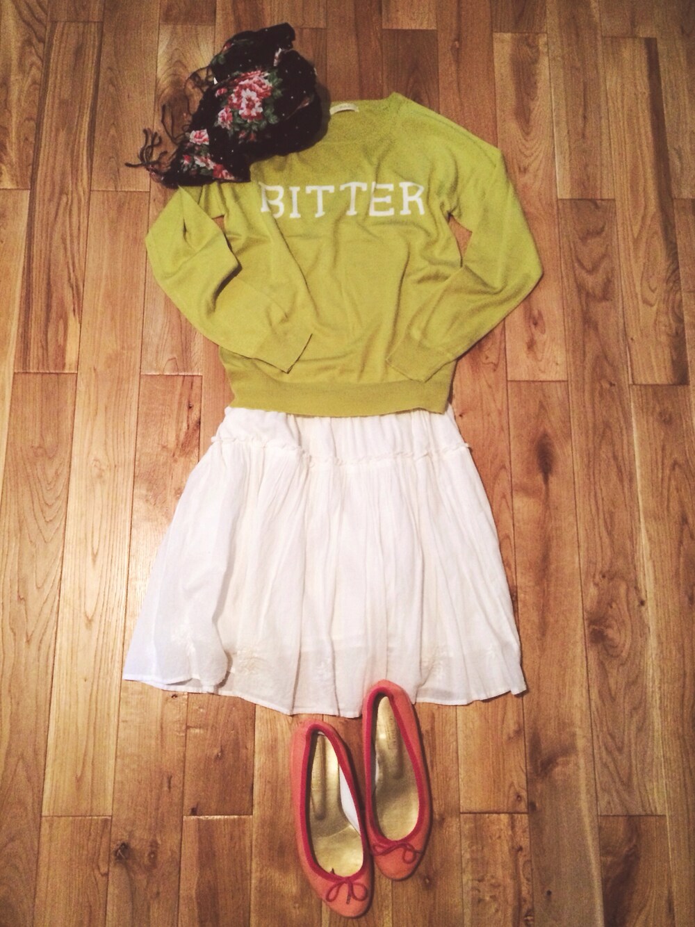 はやくあったかくなってうすいニット1枚ででかけたい〜 ロゴはBITTER だけど甘めなコーデデス☻ ストールはどこで買ったか忘れちゃった skirt:earth flat shoes:韓国でオーダーメード