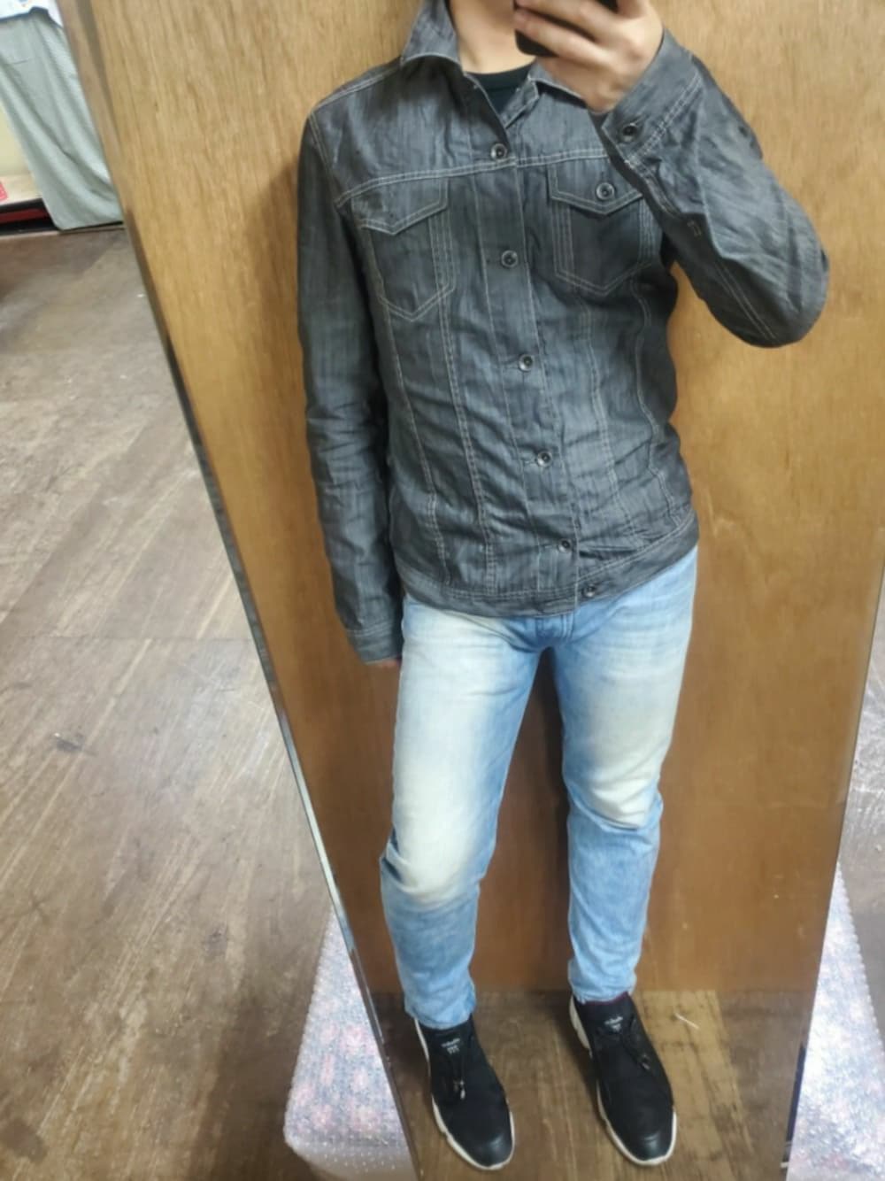 出掛けられないので、おうちファッション投稿します! DIESELのデニムに黒よりのグレーのジャケットを羽織ってみました。