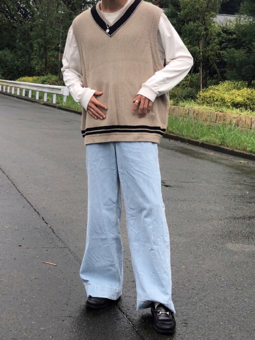 Sohta のベスト「WEGO/ビッグシルエットチルデンニットベスト」を使ったコーディネート