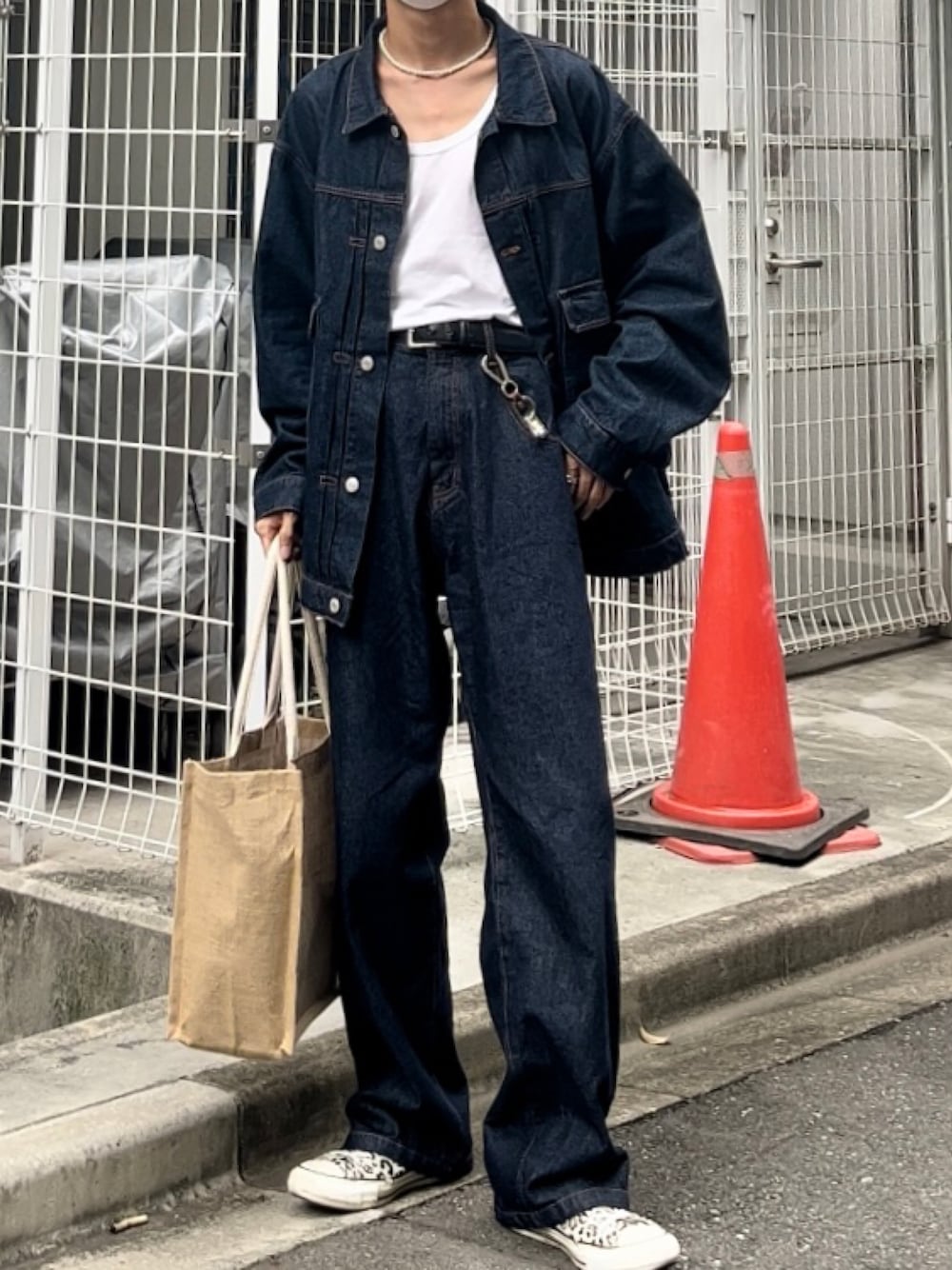 秋はセットアップ ジャケットよりもデニムの方がカジュアルに着れる タンクトップと合わせて武骨なコーデに🕶 足元はレオパードのコンバースで差別化