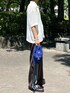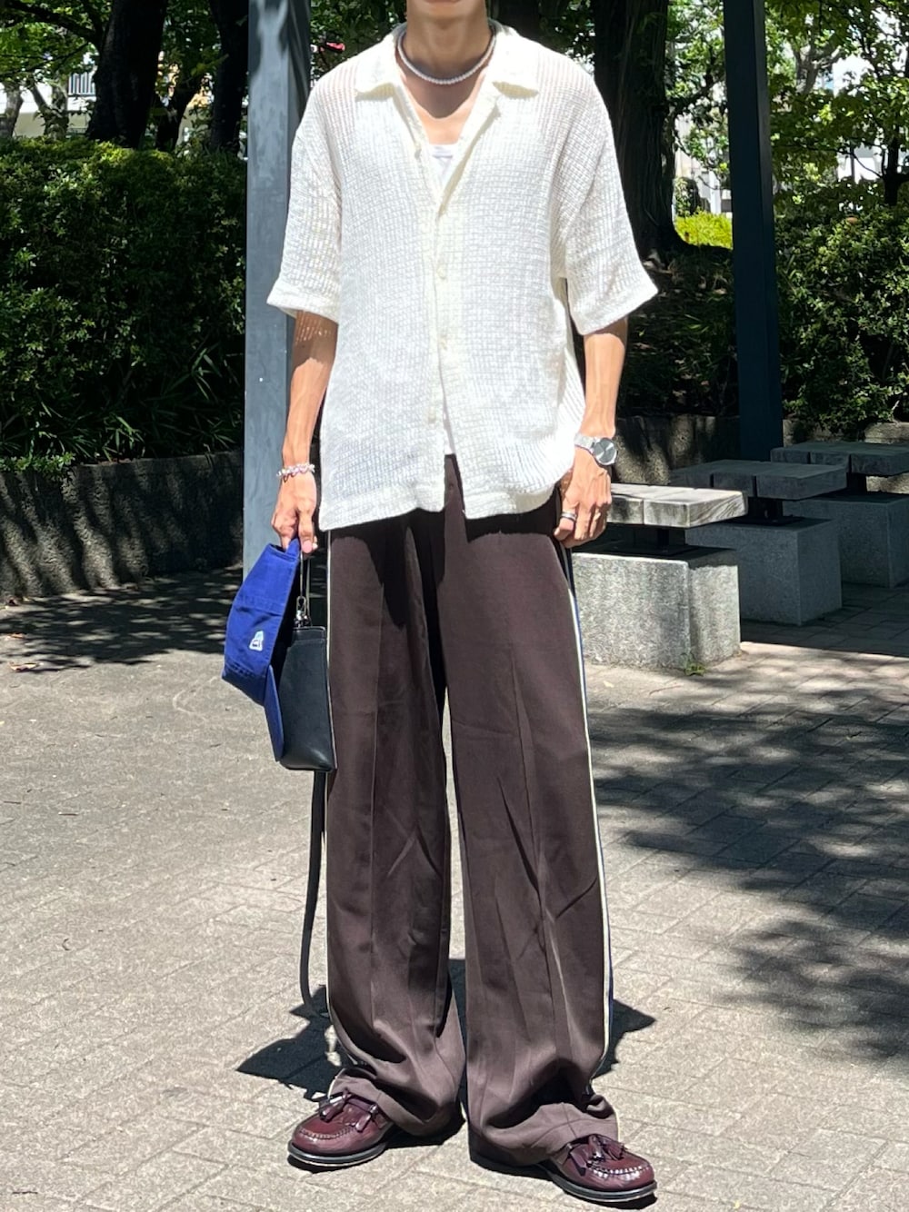 スウェットパンツにシアーシャツを合わせて力を抜いた夏らしいスタイリング✨ ラインパンツの色を拾ってブルーのキャップを取り入れました🧢