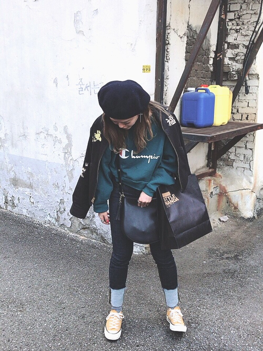 USEDのスウェットはクロップド丈! カジュアルになりすぎないように、 小物は女らしくが鉄則!