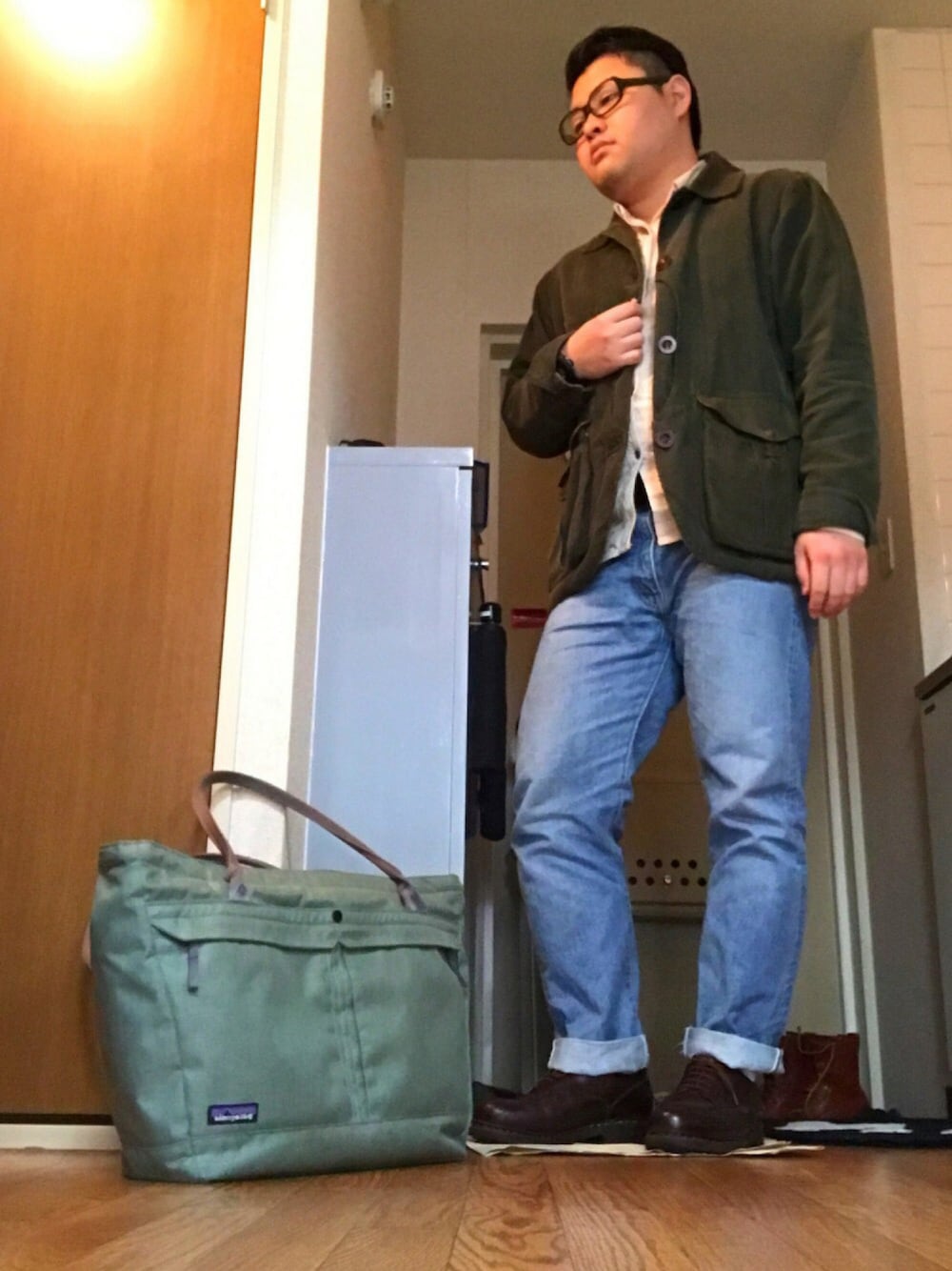 去年からお気に入りのFILSONのハンティングジャケット。 中に生成りのシャツ、相性の良いジーンズに革靴で合わせて、しっかり感を👍 パラブーツのシャンボードを履いていますが、合わせやすくて重宝しています。 パタゴニアのトートバッグ、該当アイテムに出た中に自分のものと同じ色がなさそうでしたが、改めて見てみるとカラーバリエーション豊富なようですね。 たしか購入から2、3年目ですが、軽くて使いやすいです。 荷物の多い時やPC入れる時などに活躍してくれるので気に入っています。