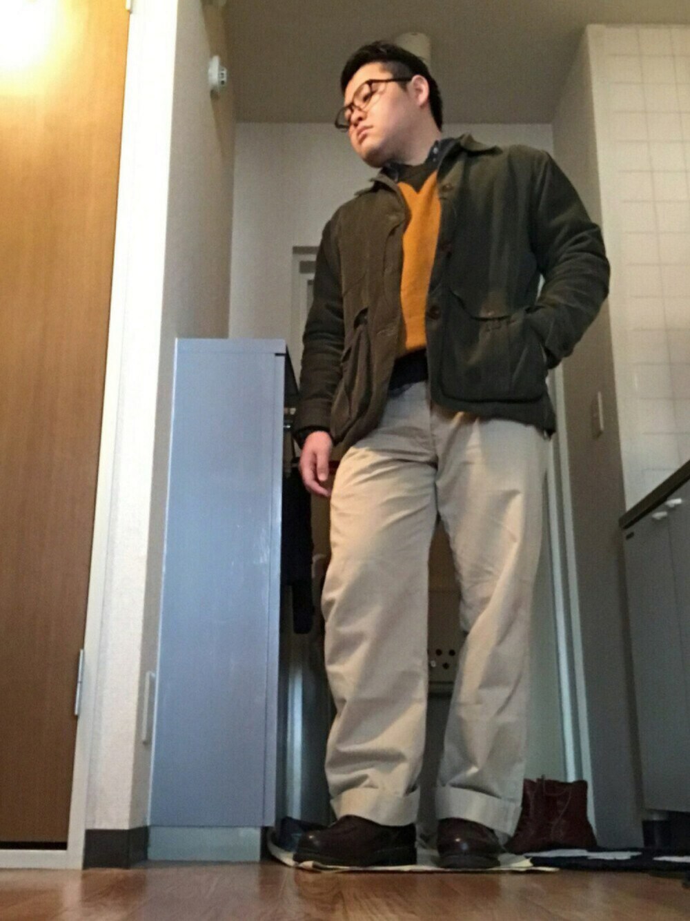 フィルソンのハンティングジャケットをアウターに、両Vのスウェット×空環仕上げのあるシャンブレーシャツを合わせてヴィンテージのディテールを取り入れた、アメカジ色の強いスタイルにしてみました。