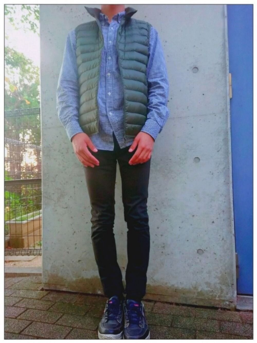 身長が低いと、シャツの裾が長くて、ダウンベストからでます! 前はよくても、後ろは、長すぎてバランスが悪いので、後ろだけインするとGood! 3点全部UNIQLOなので、完全にプチプラコーデ!