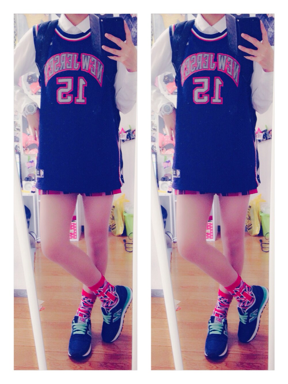 アメリカのおばさんから頂いたNBAレプリカジャージとNEW BALANCEスニーカーでスポーティー系女子☝︎(^ω^)☝︎半袖ではなく、薄いポロシャツで今の季節にぴったり。(※バスケはした事ありません。笑)