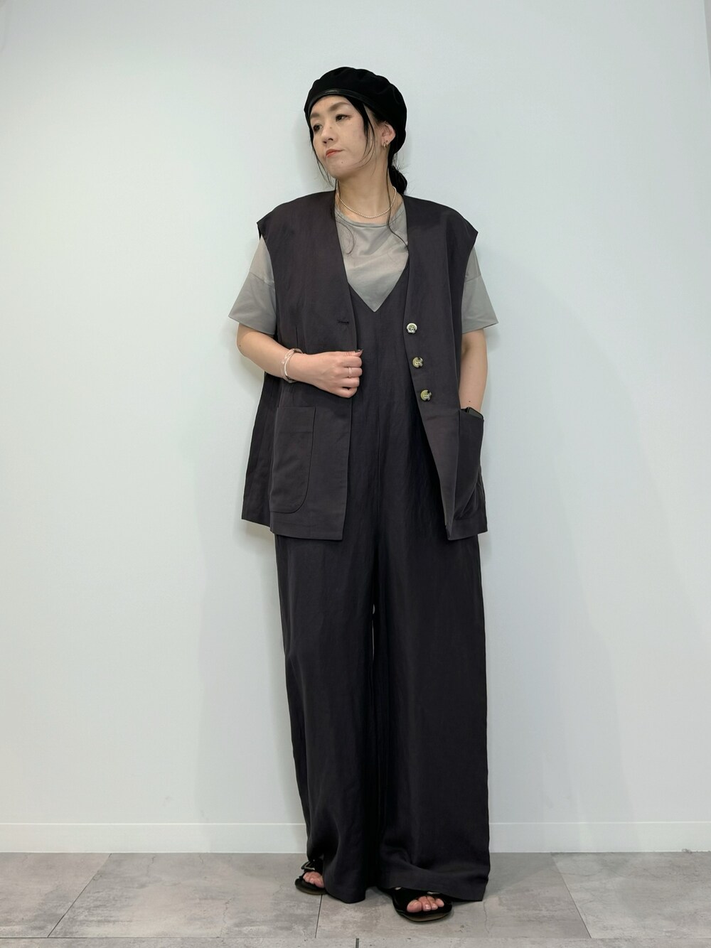 大好きなサロペットをジレとのセットアップで合わせました。Tシャツも含めて全部涼しい素材合わせです。