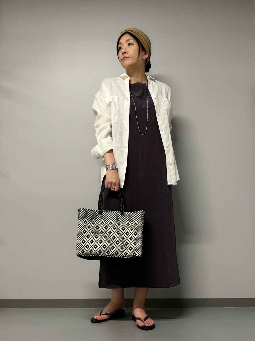 楽ちんワンピースにシャツを羽織って夏の陽射しにも負けないコーデです。