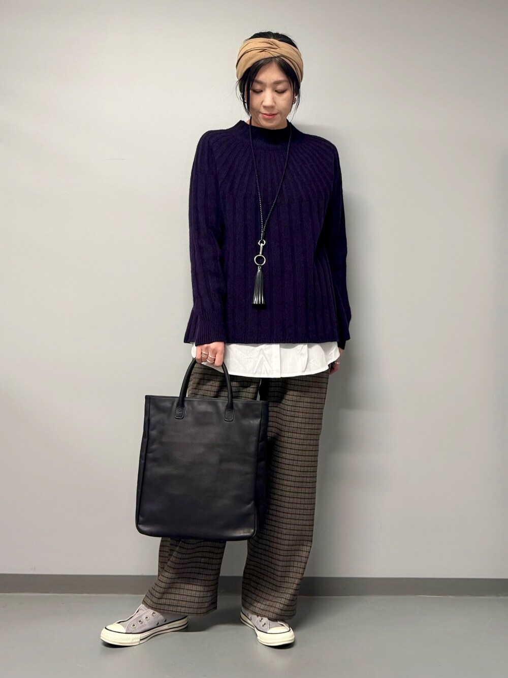 ホールガーメントのニットは着やすい!チェックのパンツも履きやすい!ラクなのが好きです。