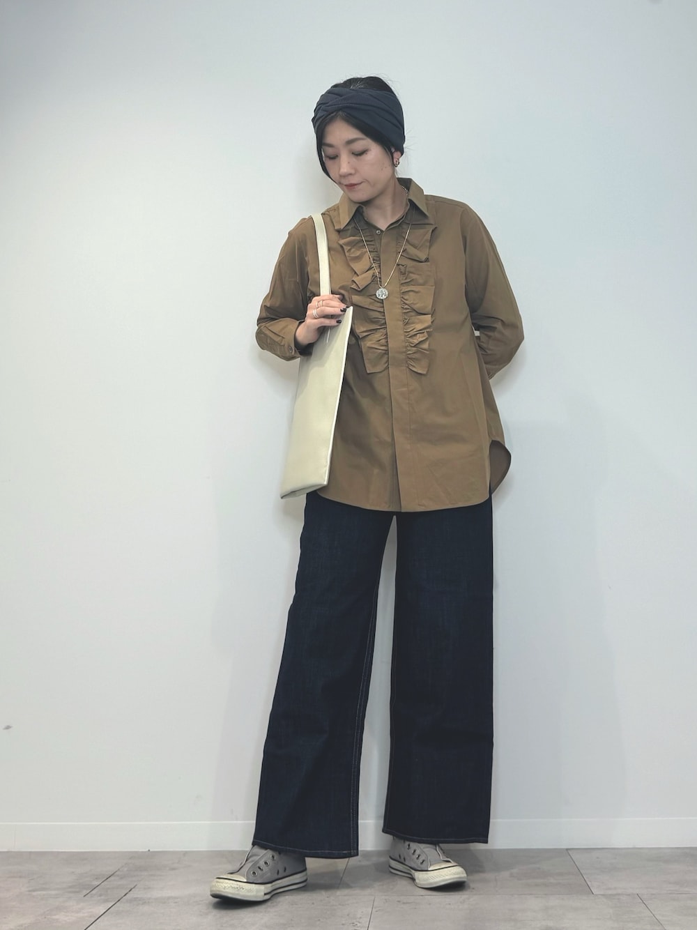 シャツ1枚なので、デザインの入ってるものを選びました。 バッグ含めシンプルなのがすきです。 ペタンコに見えてしっかりマチのあるバッグなので量も入ります!