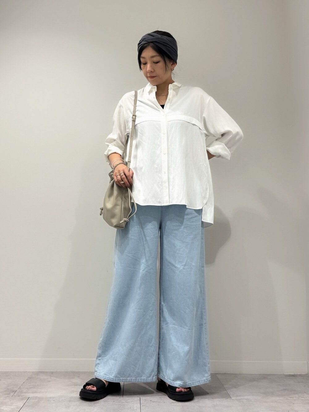 シンプルな白シャツ。 フロントタックと落ち感で大人な雰囲気になります