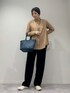 小さい衿のブラウスはとてもかわいいのですきです。裾に向かってのシルエットがとても綺麗で合わせるパンツを選びません。 バッグはテンションの上がるドラゴンで!