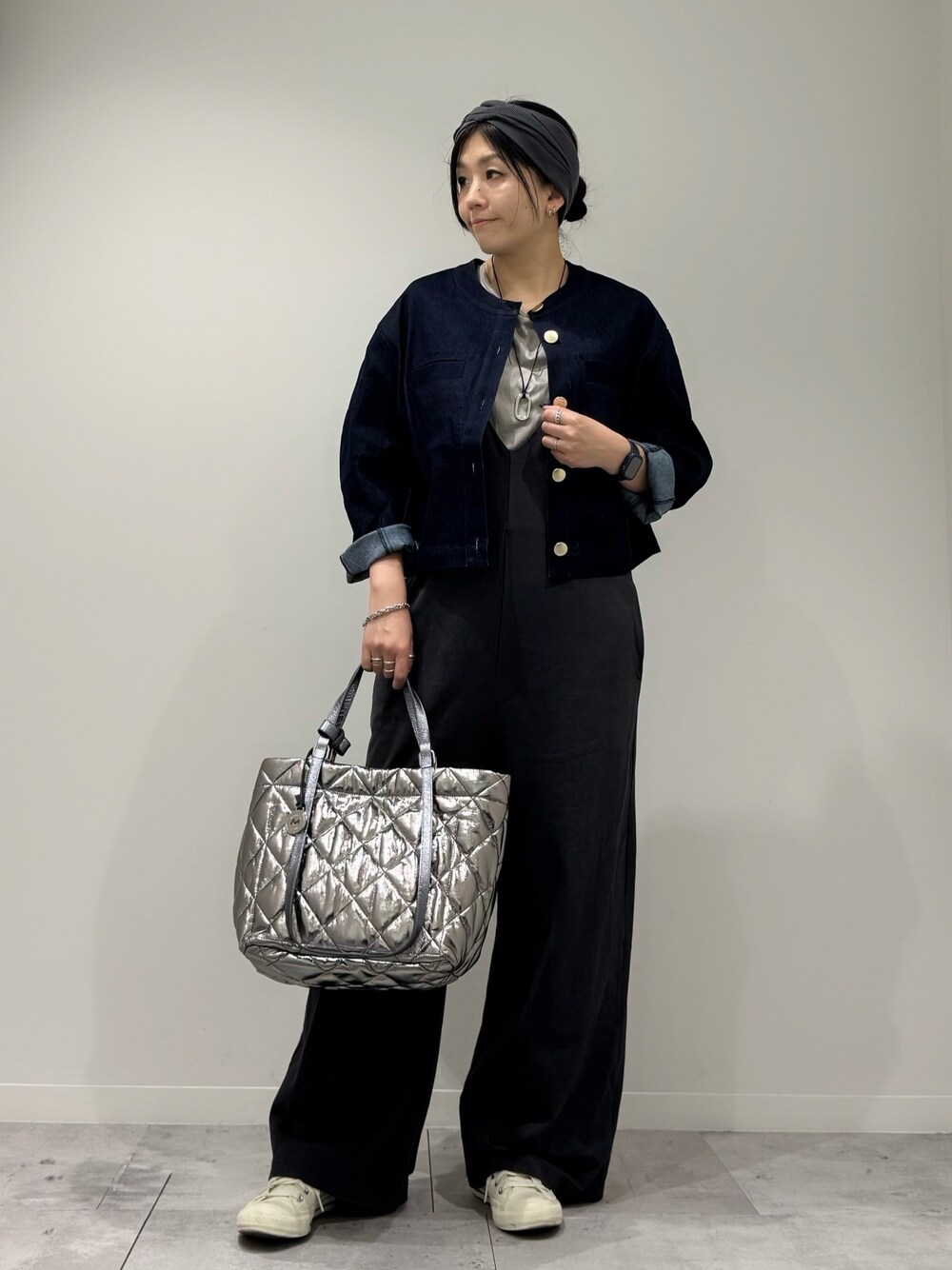ストレッチの効いたデニムジャケット。 丈が短めでシルエットがかわいいです。 キルティングのバッグも沢山入って大活躍!