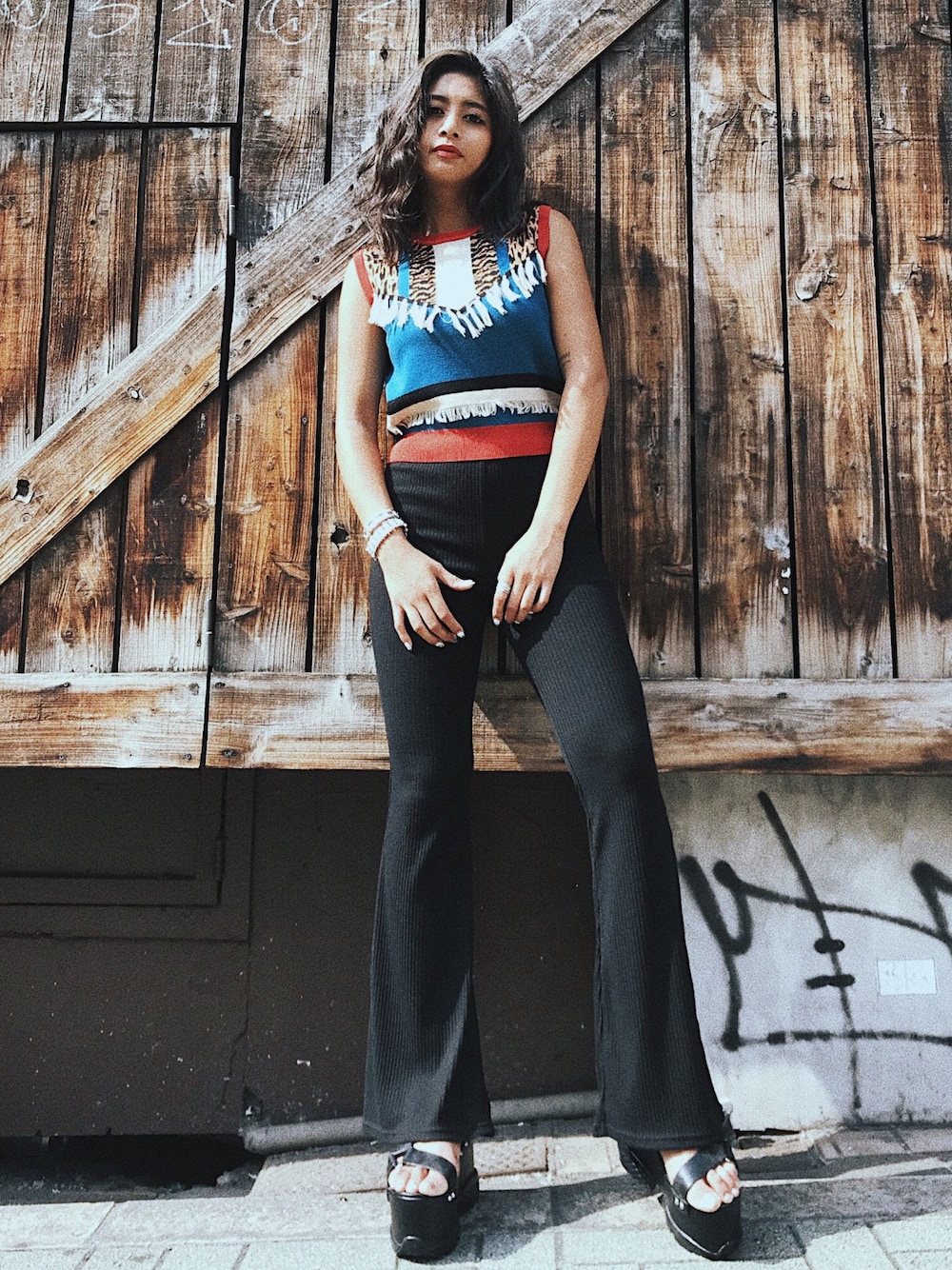 HANAEのタンクトップ「ジャガードフリンジニットタンク」を使ったコーディネート