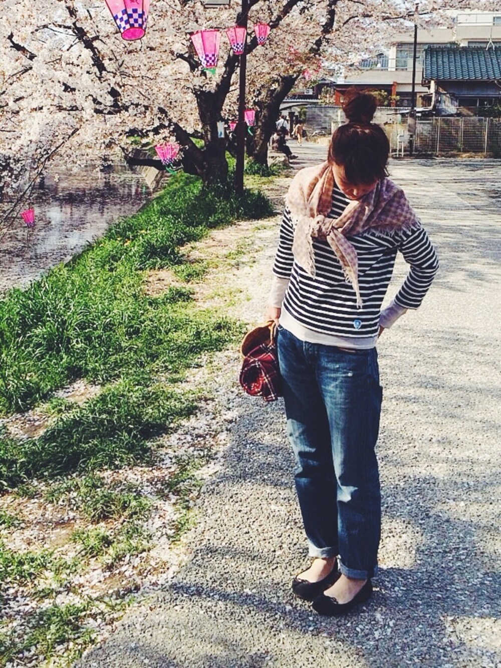ストール:flower(used) Tシャツ:ORCIVAL インナーTシャツ:ブランド不明 デニム:JOURNAL STANDARD シューズ:Repetto かごバック:ブランド不明 レジャーシート:Coleman
