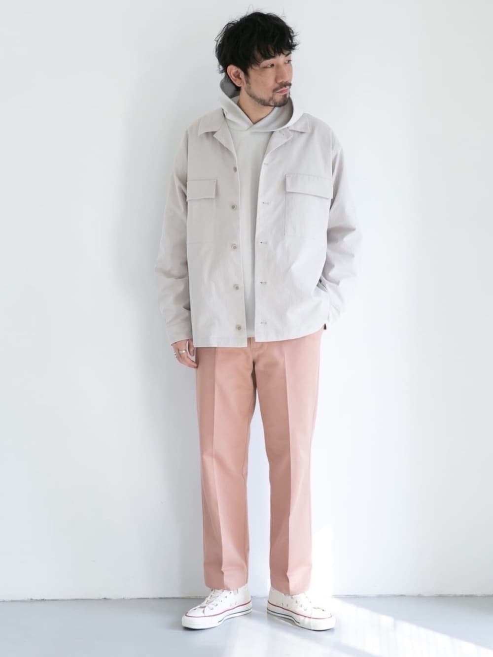 春を意識して、ポイントにピンクのカラーパンツを着用。トップスシューズはホワイト、グレーをベースに全体的に纏めています。