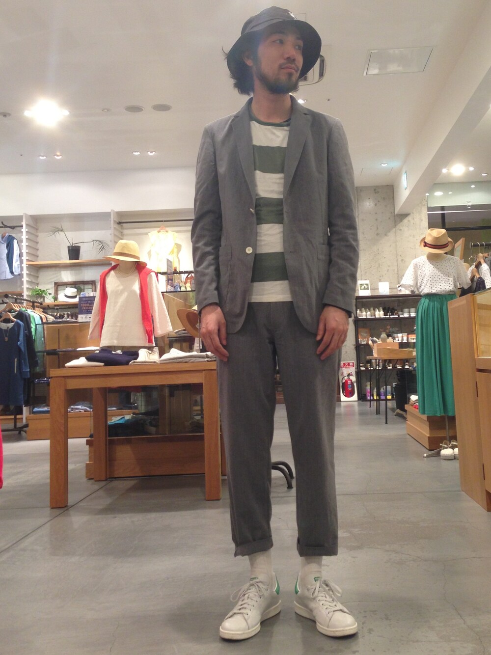 カッコつけ過ぎす、雰囲気のあるセットアップ。 スニーカーに帽子でアクセントをだしました。