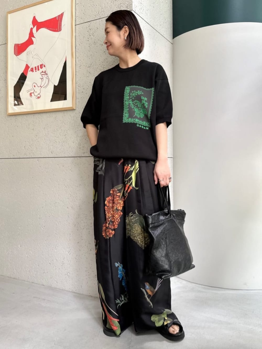 〈CABaN〉のシグニチャーアイテムでもあるオリジナルボタニカルプリントに'BIRD SINGING'柄が登場。 シルク素材の快適に履けるパンツです。 トップスは、汗ばむ季節にも最適なさらりとした肌触りが魅力のプルオーバー。 ユニセックスのSサイズを着用しています。