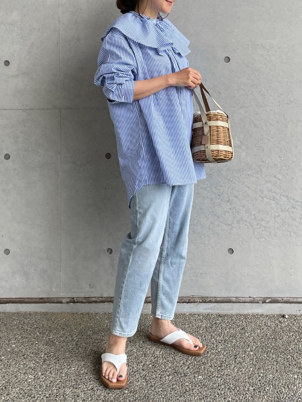 ブルー系のシャツ/ブラウスを着用したレディースの春コーディネートの1枚目の写真