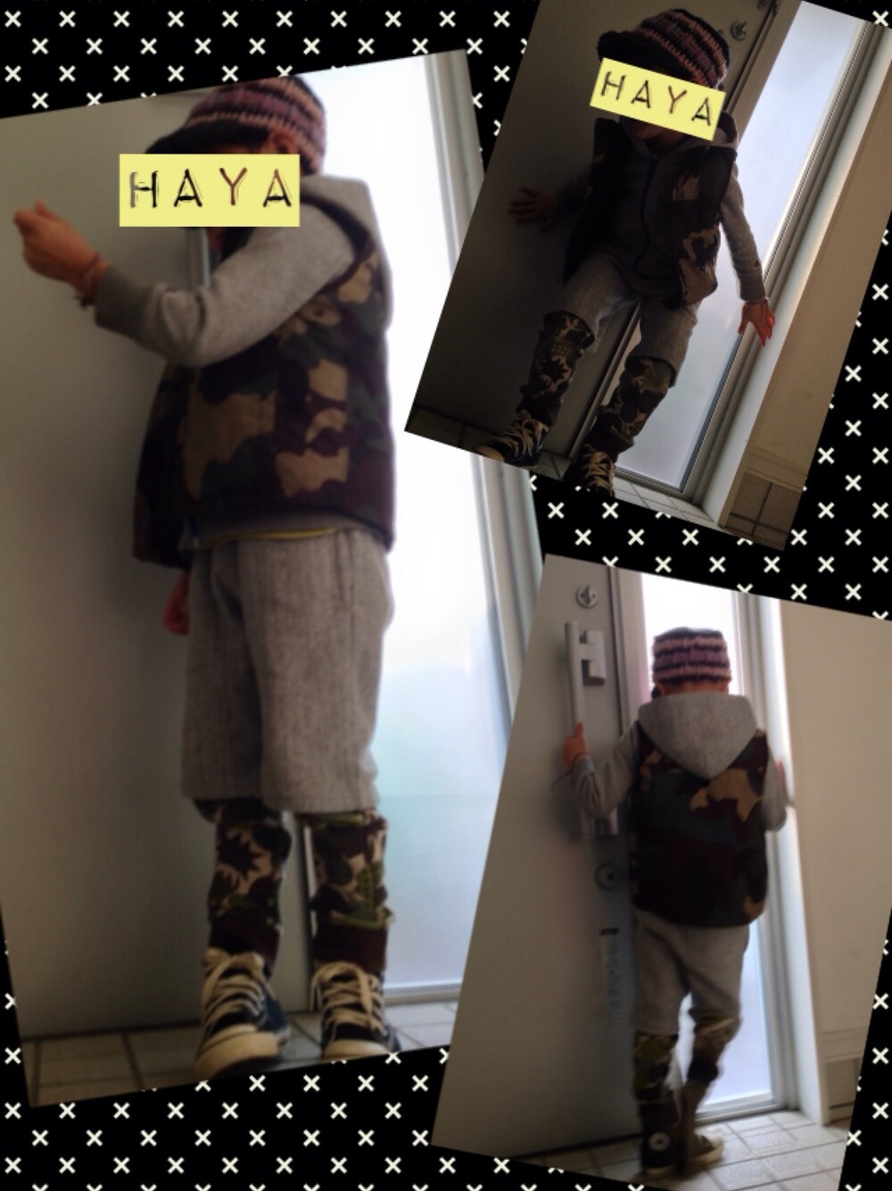 にぃに達とは色違いの。。。 Championのパーカー&ショートパンツ 帽子 で、お出掛けしたょ〜 ミサンガの位置が気になる、haya⭐️ 迷彩で目がチカチカ。。。w