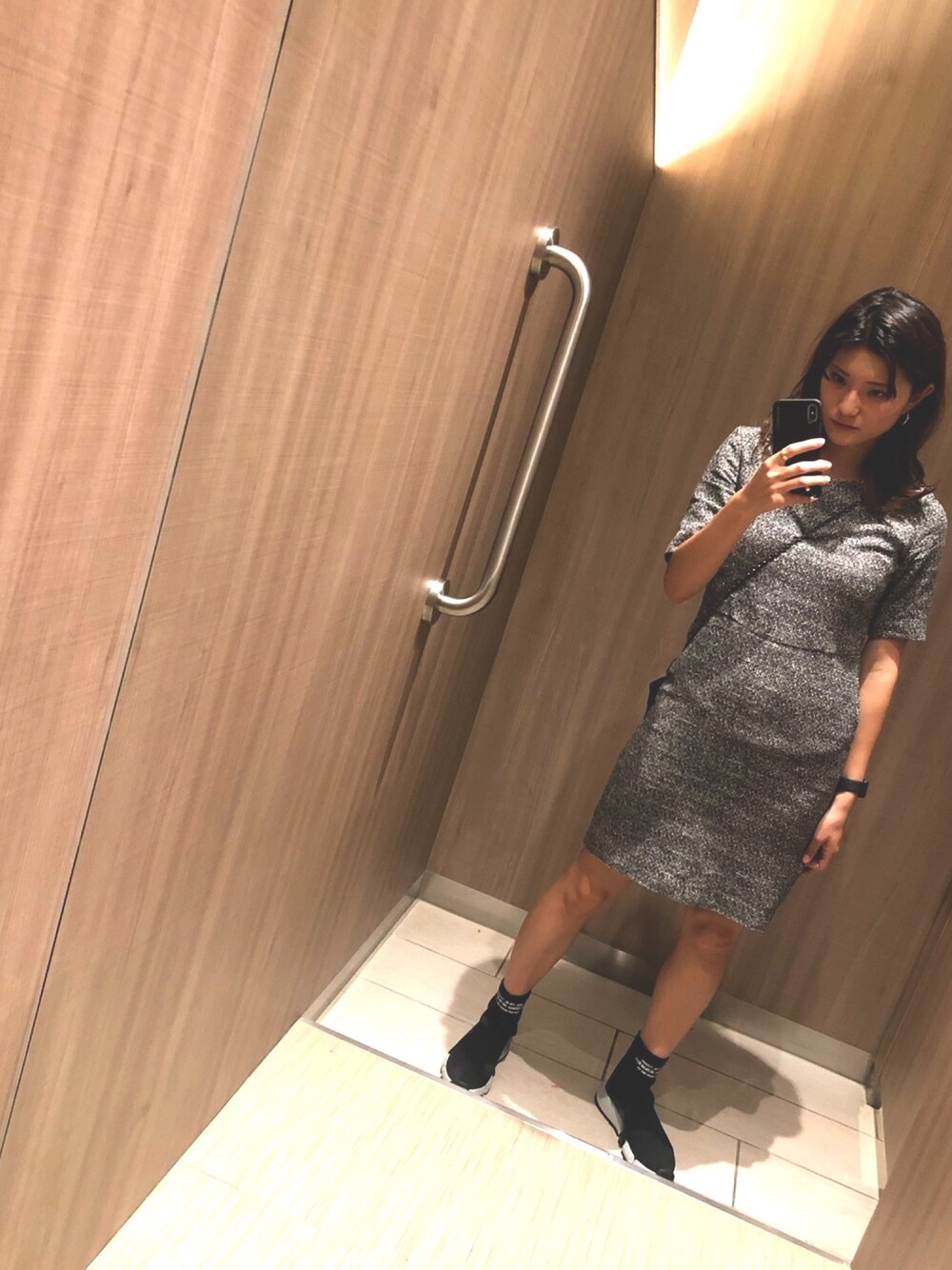 ブラック系のスニーカーを着用したレディースの秋コーディネートの1枚目の写真