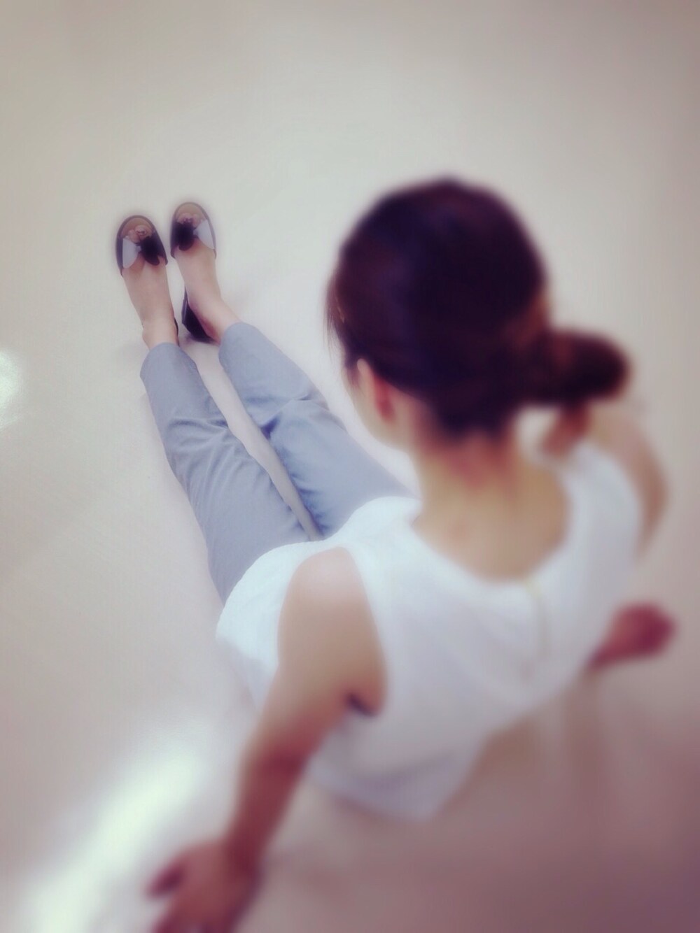 ブラック系のサンダル、グレー系のその他パンツ、ホワイト系のタンクトップを着用したレディースの夏コーディネートの1枚目の写真