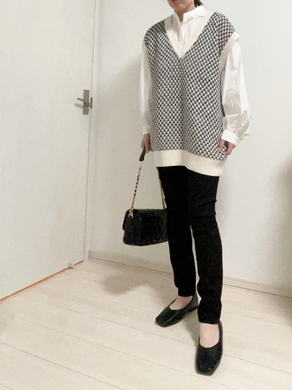 ハナコユキのベスト「Vネックリンクス編みニットベスト」を使ったコーディネート