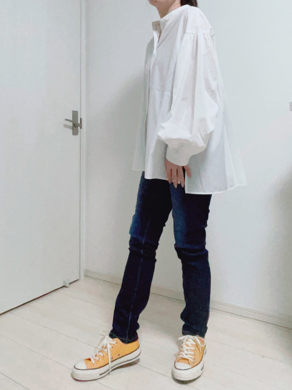 * ご覧いただきありがとうございます☺️ꕤ いいね、お気に入り、フォロー、 とてもうれしいです🏋🏽♡ * ふんわり袖のブラウスにデニム合わせで シンプルに🎠𓈒𓂂 コンバースのMANGO ORANGEを 差し色にしました☺️○°