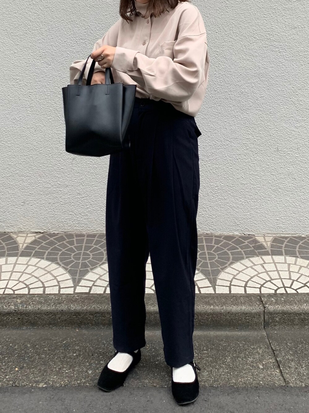 おはようございます☀️ いつも見てくれてありがとうございますっ!! ネイビーカラーのパンツにハイネックの スタンドカラーシャツでシックに◎ 小物もブラックで落ち着いた雰囲気に。 カンフーシューズでガーリーさも!! インスタもやってます↓ @flower__530 🌼