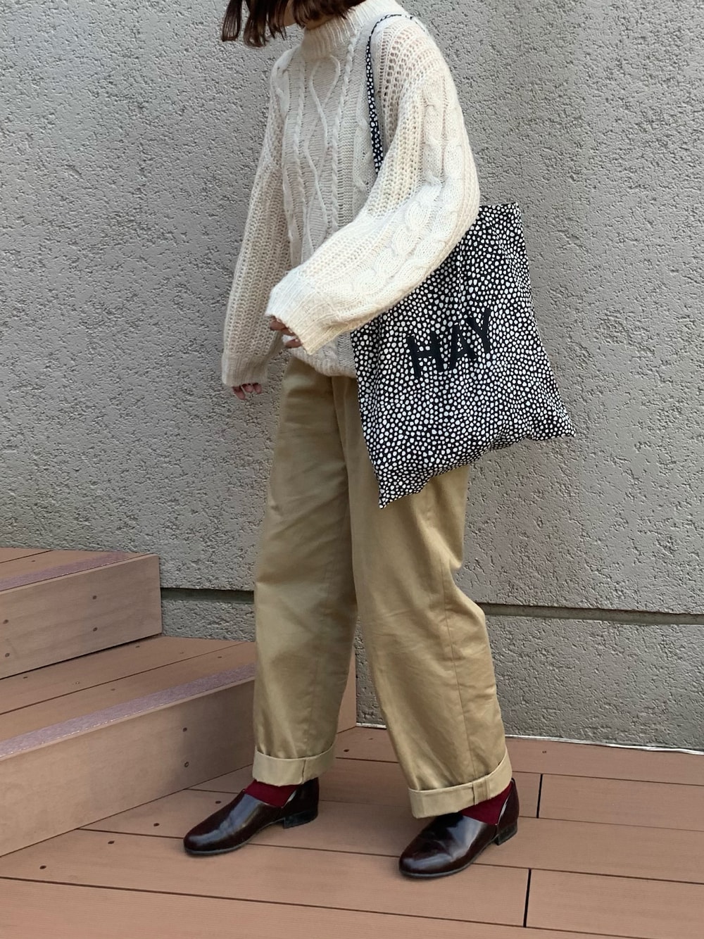 おはようございます☀️ いつも見てくれてありがとうございますっ!! ケーブルニットにチノでカジュアルに。 足元はスポックでキレイめさをプラス◎ 淡色コーデだけどトートとスポックの 暗めのカラーがいいアクセントです!! インスタもやってます↓ @flower__530 🌼