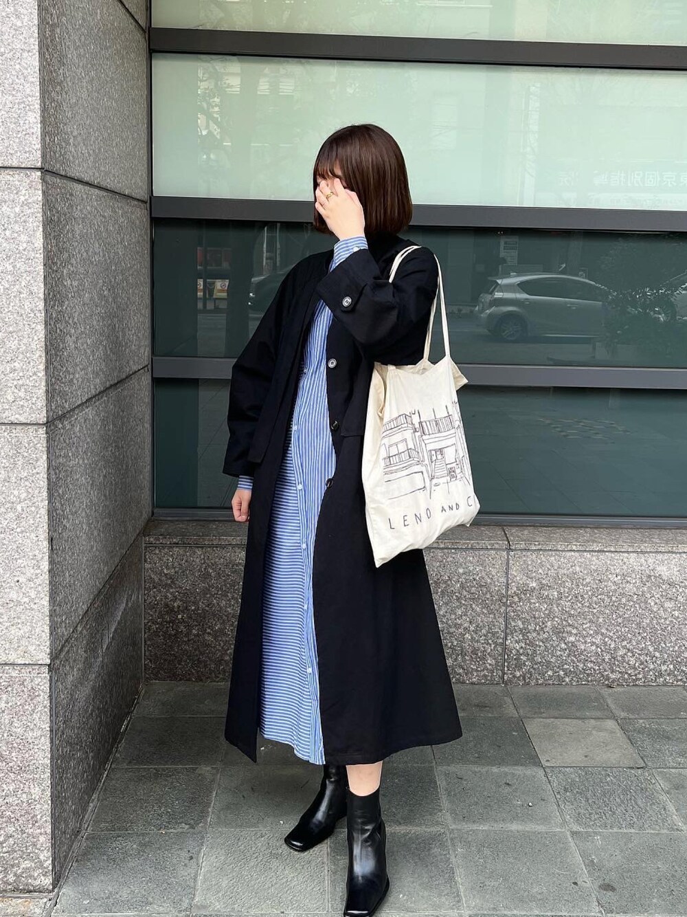 おはなのワンピース「アシンメトリーシャツワンピース」を使ったコーディネート