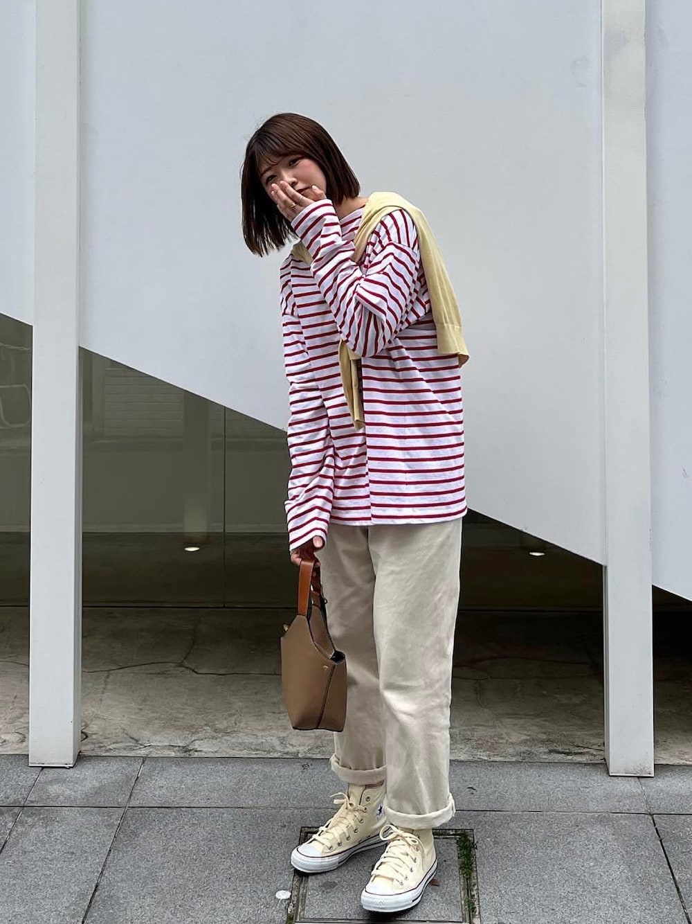 おはようございます!! いつも見てくれてありがとうございます😊 赤ボーダーに白デニムで上品に。 オールスターでボーイッシュにも◎ Instagram▷▶︎▷ @flower__530