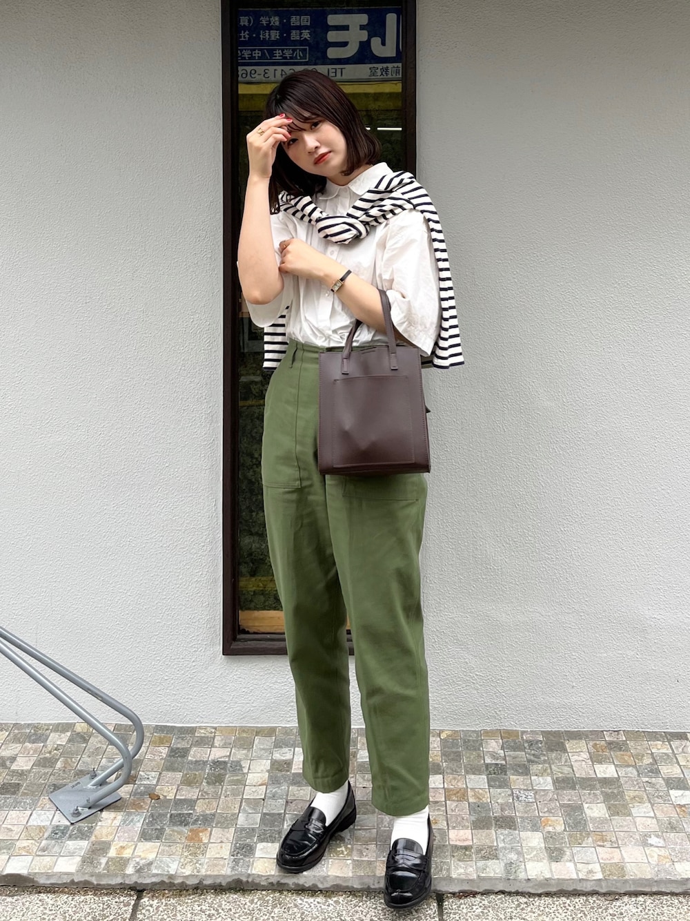 おはようございます!! いつも見てくれてありがとうございます😊 ベイカーパンツ×シャツにボーダーを肩掛け してプラスしたカジュアルコーデ◎ タックインで脚長効果抜群です〜!! Instagram▷▶︎▷ @flower__530