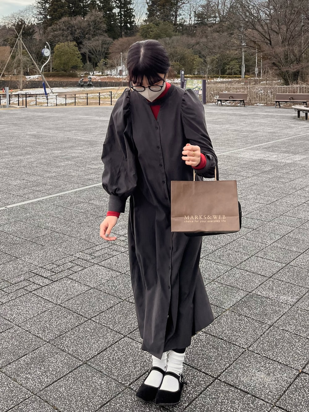黒いロングワンピースに赤の差し色でキレイめコーデ◎ 首元と手首から見える赤が大人らしさを出しててポイントです!! Instagram▷▶︎▷ @flower__530