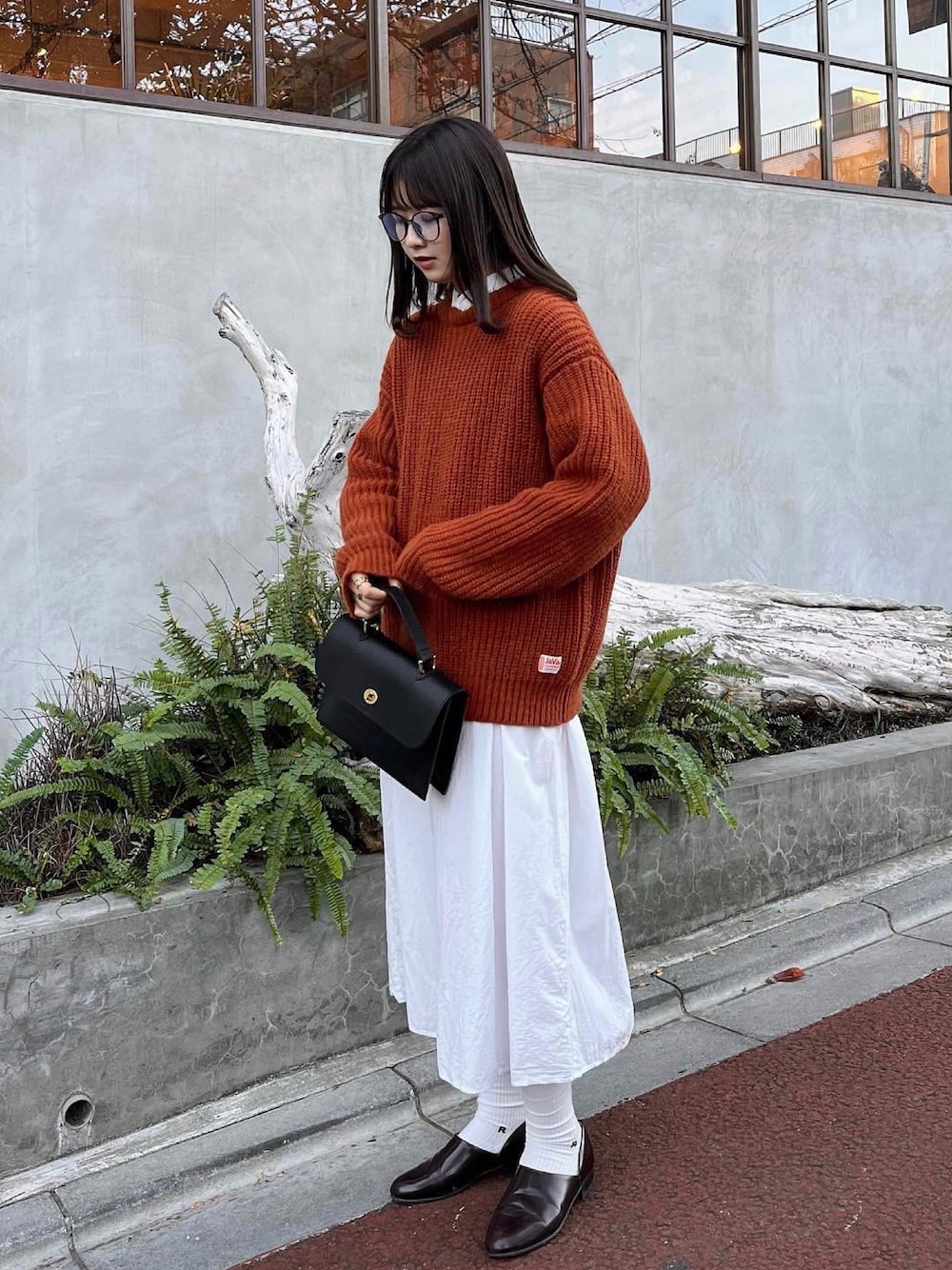 秋冬らしい色味のニットに白ワンピースをレイヤードして 女の子らしさも取り入れつつ、小物でキレイめをプラスしました◎ Instagram▷▶︎▷ @flower__530