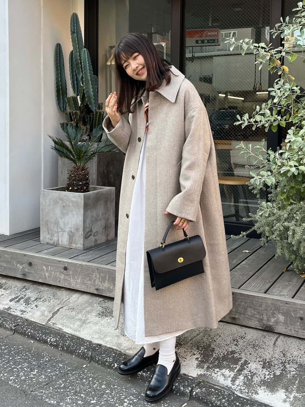おはなのステンカラーコート「<CITEN>ウールライク ビッグ バルカラーコート チェック」を使ったコーディネート