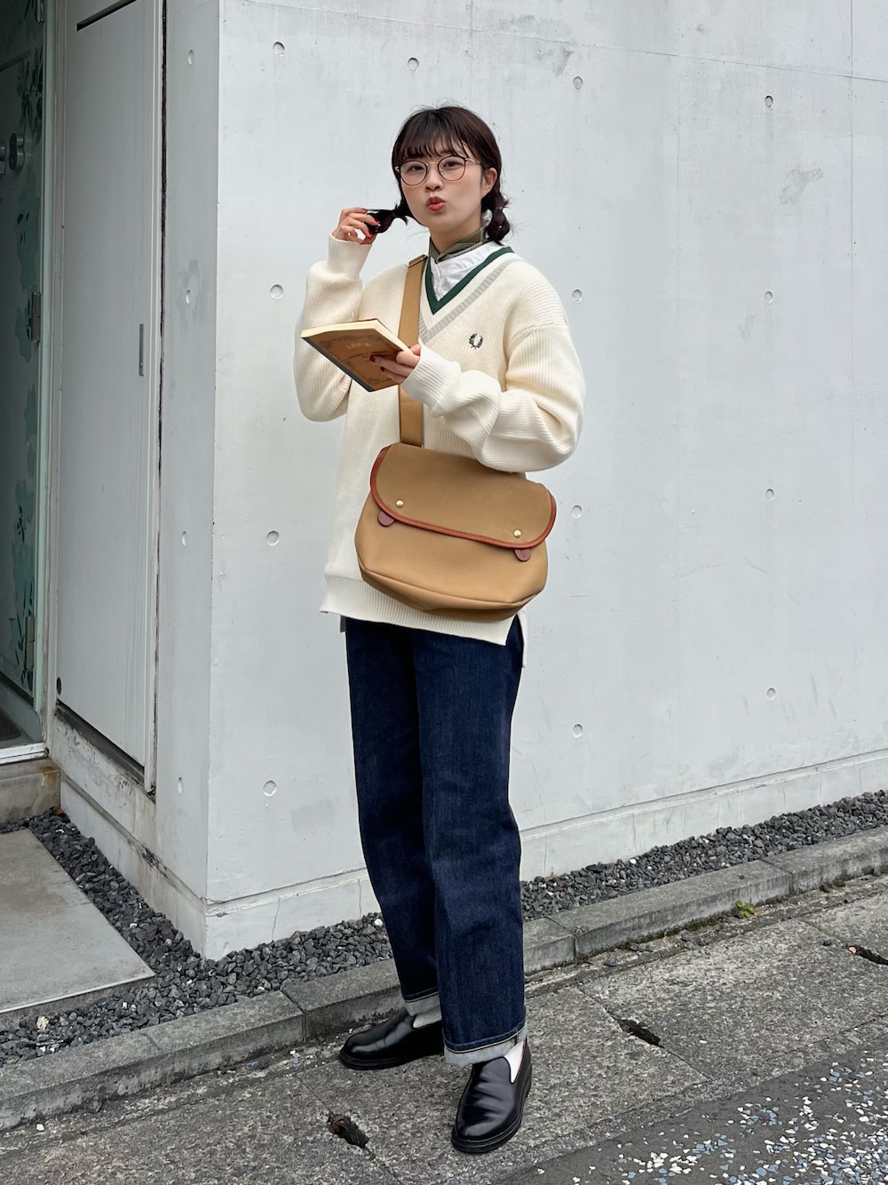 シャツにfred perry のニットをレイヤード◎ デニムに合わせたらカジュアルで可愛くなった♡ メガネや革靴で一気にキレイめカジュアルでおすすめな組み合わせです!! Instagram▷▶︎▷ @flower__530