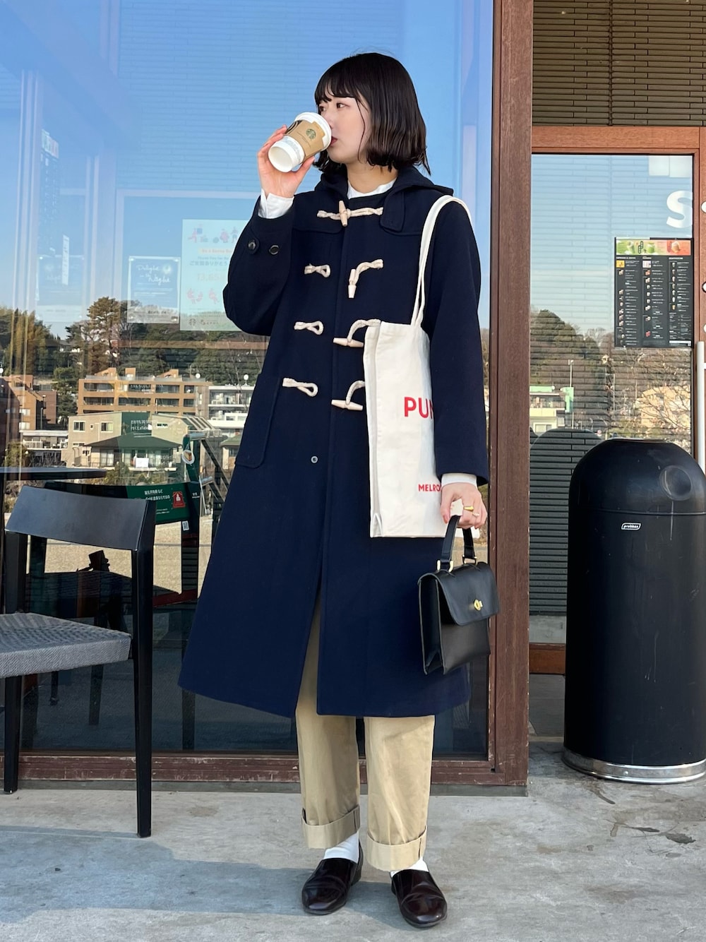 ダッフルコートにチノパンが可愛い♡ ベージュに紺って相性いいよね〜〜! バッグ2個持ちもポイントです◎ Instagram▷▶︎▷ @flower__530