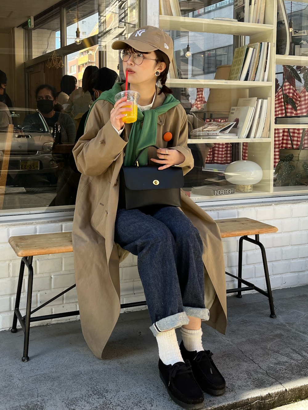 ユニクロの緑カーディガンをコートに肩掛け◎ キャップやメガネを使ってバランスのとれたコーデです🧢