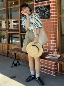 ショートパンツを使った激アツな夏コーデ🌻 大きめのシルエットのボーダーをチョイスして、 上下バランスよくするために大きめのトートバッグをプラスしました🫶🏻