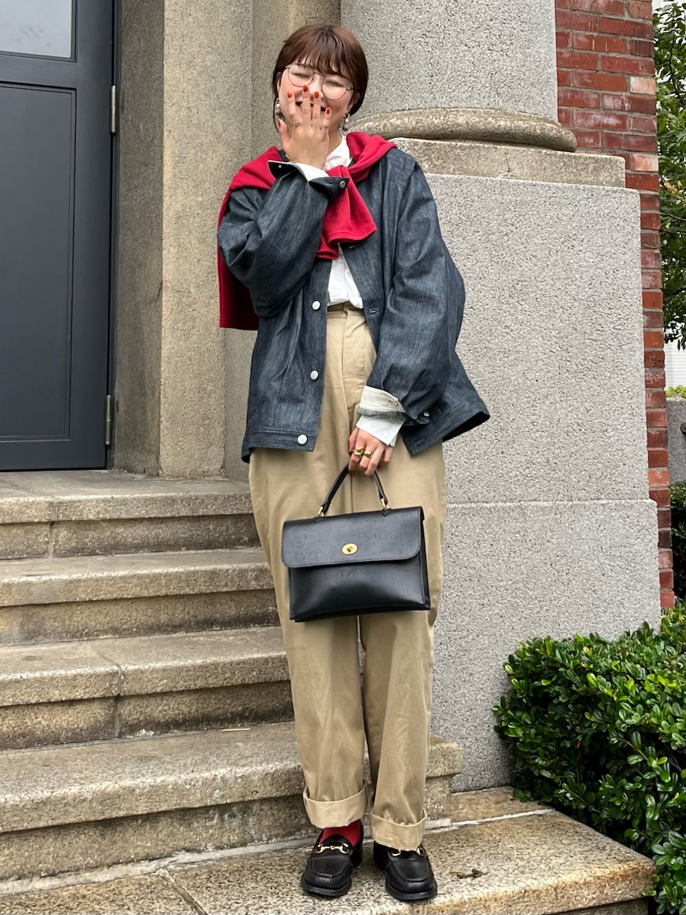 LENOのチノパン×UNFOLKのデニムジャケット🐿🌰 秋らしいカラーの組み合わせに、 差し色の赤カーディガンがポイント◎