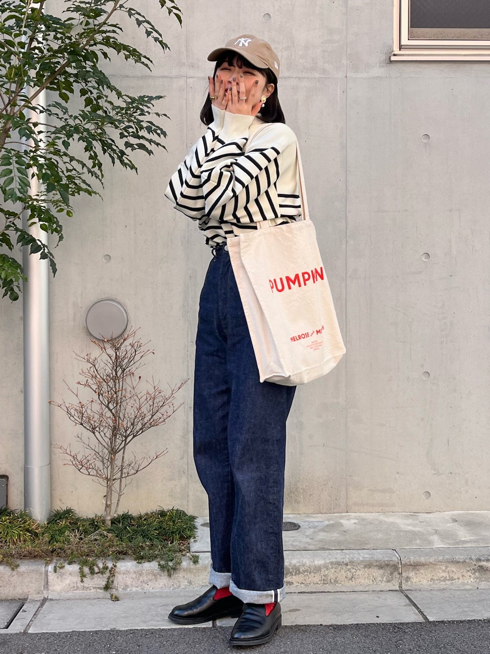 デニムにボーダーのカジュアルなコーデ。 差し色の赤が得意分野で、今回のコーデは 重く見えがちなローファーの中にいれました🍎