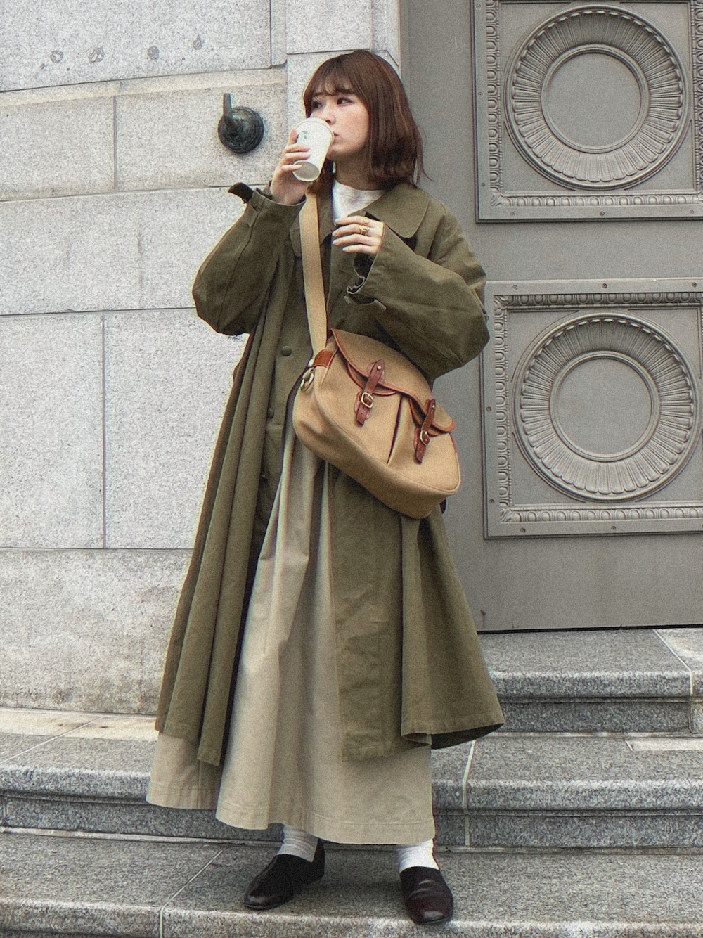 古着のコートをミックスさせたコーデ🧥 ロングスカートもよく合う🫣bradyのバッグが絶妙に合っててドンピシャすぎる👜